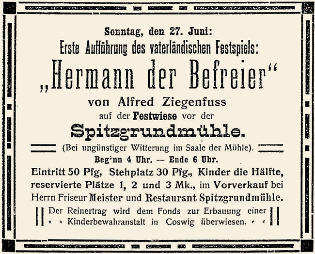 Veranstaltet vom Coswiger Evangelischen Arbeiterverein, unter der Leitung des Coswiger Pastors Albrecht, wurde das Stück "Hermann der Befreier“ auf einer Wiese hinter der Spitzgrundmühle aufgeführt. Die erste Vorstellung war am Sonntag, 27. Juni 1909. Bis zum 18. Juli konnte das Festspiel an den folgenden Sonntagen besucht werden.