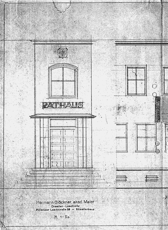 Nach 1945 gab es keine grundlegenden baulichen Umgestaltungen am Rathaus mehr. Einen interessanten Fakt halte ich aber noch für erwähnenswert. In seiner Sitzung am 18. November 1946 stellte der Finanz- und Verwaltungsausschuss fest, dass es unbedingt notwendig sei, "an der Vorder- und Straßenseite des Rathauses die Beschriftung ‘Rathaus Coswig‘ anbringen zu lassen“. Kein geringerer als der Dresdner Maler, Zeichner und Plastiker Hermann Glöckner (1889 – 1987) zeichnete dazu Entwürfe. Da die finanziellen Mittel knapp waren, wurde dieses Vorhaben zugunsten einer neuen Heizungsanlage zurückgestellt.
