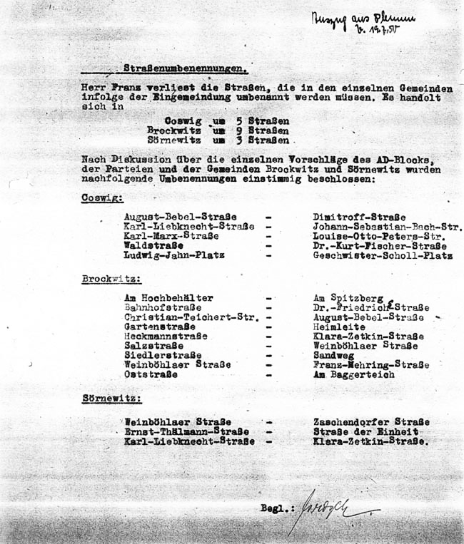 Die umfangreichen Straßenumbenennungen durch die Eingemeindung von Sörnewitz und Brockwitz 1950 verdeutlicht nebenstehende Übersicht: