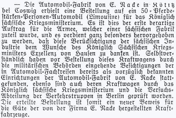 Viele Zeitungsartikel aus dieser Nacke‘schen Gründerzeit sind im Stadtarchiv überliefert. Vom 2. - 18. Februar 1906 fand in Berlin eine Internationale Automobilausstellung statt, wo die Firma Nacke mit einem sehr schön ausgestatteten Tourenwagen vertreten war. Das Coswiger Tageblatt vom 3. März 1906 berichtete, dass sogar seine Majestät der deutsche Kaiser längere Zeit an Nackes Stand verweilte. Im Mai 1906 kaufte der Sächsische König einen Jagdomnibus mit zehn Plätzen, dessen „... Chassis (Unterteil nebst Maschine) aus der hiesigen, sich im Automobilbau großen Renommèes erfreuenden Maschinen-Fabrik E. Nacke stammt ...“ So war es neben einer ausführlichen Schilderung der recht abenteuerlichen Probefahrt am 6. Mai 1906 im Coswiger Tageblatt zu lesen. Am 31. Juli 1907 konnte die Zeitung folgende Meldung bringen: