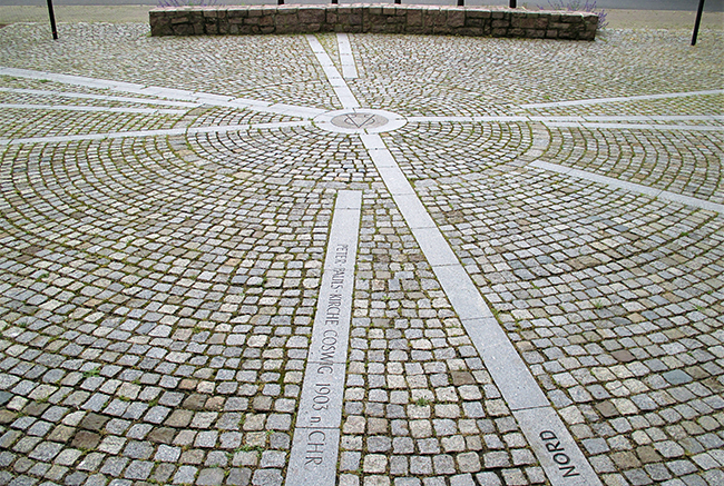 Von diesem Zentrum aus führen Strahlen zu wichtigen christlichen Gründungen. Namen und Jahreszahlen sind in Schriftarten verzeichnet, die zu jenen Zeiten an den jeweiligen Orten gebräuchlich waren. Heinz Koop hat die Koordinaten berechnet und mit Kompass exakt eingemessen.