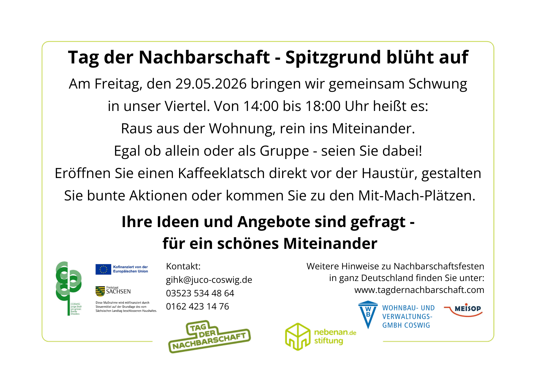 Eröffnen Sie einen Kaffeeklatsch direkt vor der Haustür, gestalten Sie bunte Aktionen oder kommen Sie zu den Mit-Mach-Plätzen. Ihre Ideen und Angebote sind gefragt - für ein schönes Miteinander.