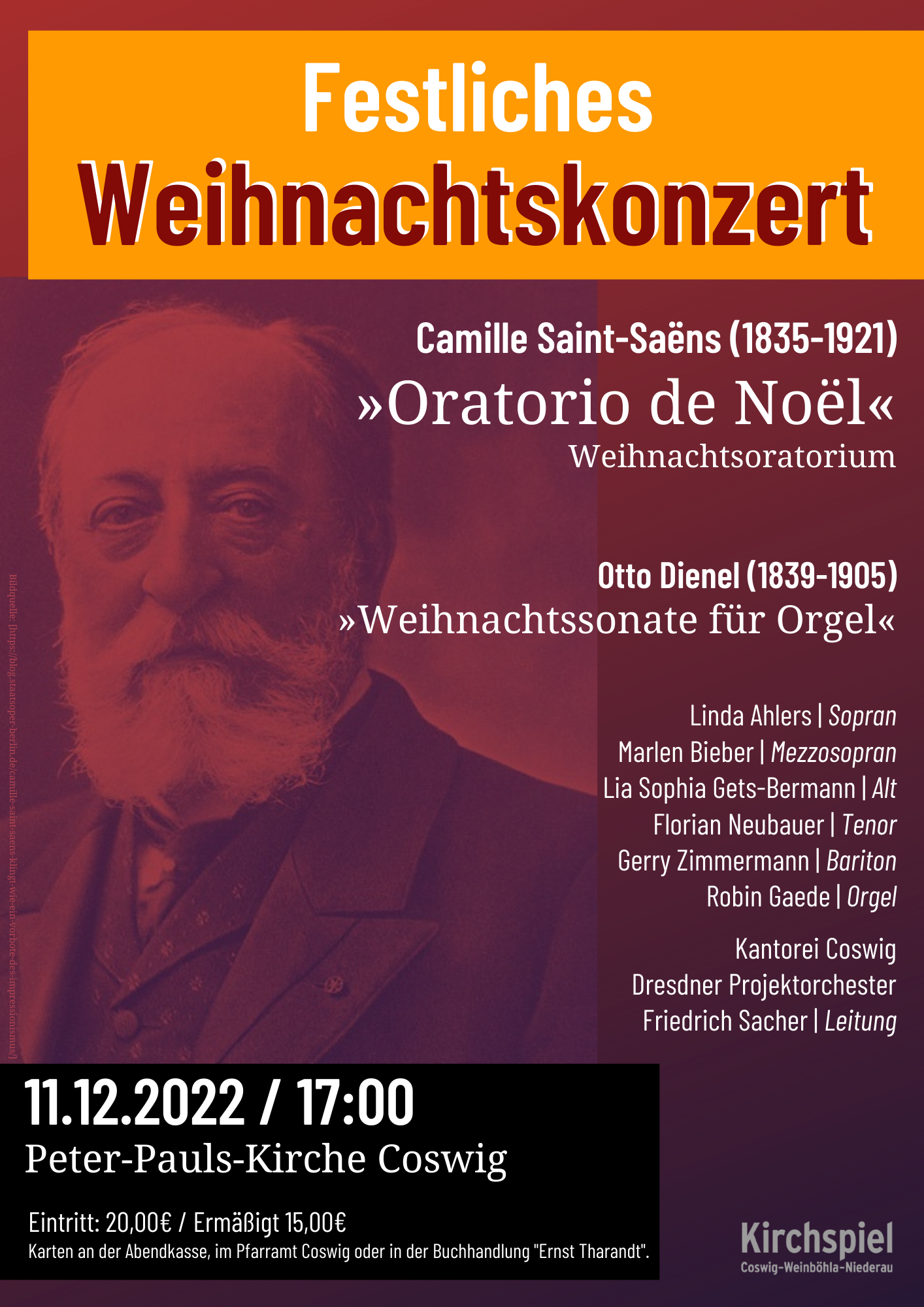 Am Sonntag, 11.12.2022 um17.00 Uhr erklingt in der neuen Peter-Pauls-Kirche das „Oratorio de Noël“ (Weihnachtsoratorium) von Camille Saint-Saëns sowie die „Weihnachtssonate für Orgel“ von dessen Zeitgenossen Otto Dienel (s. Anlage)