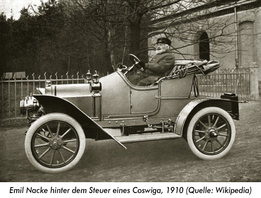 Emil Hermann Nacke (29.10.1843 - 30.05.1933) baute im Jahr 1900 in Kötitz (heute Teil von Coswig) das erste sächsische Automobil namens „Coswiga“. 1910 waren sieben verschiedene Pkw-Typen in der Fertigung. Seinen Double-Phaeton 35 HP fuhr sogar Kaiser Menelik II. von Abessinien. 1912 verkehrte der Nacke-Omnibus für 12 Personen auf eigenen Linien. Produziert wurde bis 1930, zuletzt nur Nutzfahrzeuge: Busse, Kommunalfahrzeuge, Feuerwehren und Motorfeuerspritzen.