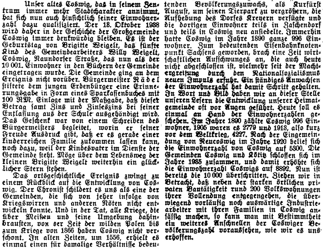 Am 8. Januar 2005 konnte die Coswigerin Olga Weigelt bei guter Gesundheit ihren 100. Geburtstag feiern. Die Tagespresse berichtete darüber. 1938 war Frau Weigelt schon einmal Hauptperson von Pressemeldungen. Mit der Geburt ihrer Tochter Brigitte am 13. Oktober 1938 wurde in der damaligen Großgemeinde Coswig das zweite Zehntausend an Einwohnern begonnen. Das Überschreiten von 10000 Einwohnern war kein unwichtiger Fakt bei der Verleihung der Bezeichnung "Stadt“ an Coswig ein knappes Jahr später. Ganz im Sinne der nationalsozialistischen Ideologie berichtete das Meißner Tageblatt vom 19. Oktober 1938 von diesem Ereignis.
