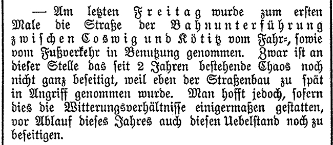 “Das Königliche Finanzministerium … ist geneigt, einem geäusserten Wunsche entsprechend den Coswig – Kötitzer Kommunikationsweg in einer lichten Weite von 7 Meter und in einer noch möglichen Lichthöhe von nur 3 bis 3,2 Meter für leichten Wagenverkehr unter dem Bahnhofe Coswig hindurchzuführen, dafern die Gemeinde unter gewissen Bedingungen eine angemessene Vorfluth für die Unterführung beschafft. …“