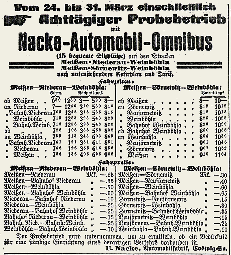 In den folgenden Jahren forcierte man Pläne zur Verlängerung der Straßenbahn in verschiedenen Varianten nach bzw. von Meißen - ebenso ohne Erfolg. Erst eine Mitteilung der Königlichen Amtshauptmannschaft Meißen vom 1. Dezember 1911 an den Gemeinderat in Sörnewitz setzte ein Hoffnungszeichen: Der Kraftwagenfabrikant Emil Hermann Nacke in Kötitz beabsichtigt – zunächst 8 Tage auf Probe – einen fahrplanmäßigen Automobil-Omnibus-Verker zwischen den Ortschaften A. Meißen – Sörnewitz – Weinböhla und B. Meißen – Niederau – Weinböhla zu eröffnen. … Nacke erprobte bereits eine Autobuslinie von Freiberg nach Hainichen, der weitere folgen sollten.
