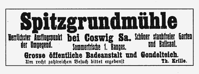 Theodor Krille, Besitzer der Sägemühle, eröffnete nach dem Restaurant "Spitzgrundmühle" am 8. Juni 1910 eine weitere Attraktion im Spitzgrund. Durch Anstauen des Lockwitzbaches war bereits 1893 ein Teich unterhalb des Spitzberges entstanden, der dem Mühlenbetrieb diente. Mit schöpferischem Unternehmergeist, der jedem Investor heute zur Ehre gereichen würde, wandelte er diesen Teich in eine öffentliche Badeanstalt mit Gondelteich um. Mit mehreren Anzeigen warb Theodor Krille im Coswiger Tageblatt für seine "Badeanstalt zur Spitzgrundmühle".