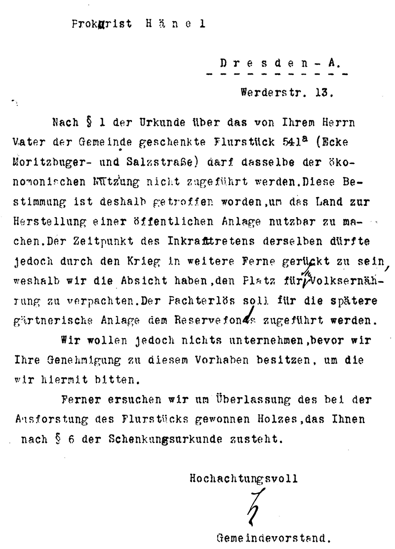 Sicherlich ging der Gemeinderat mit guten Vorsätzen an die Umsetzung des Hänelschen Vermächtnisses. 1901 erfolgte bereits die Zergliederung des Grundstückes und in den folgenden zwei Jahren wurde mit Gärtnereien zur Gestaltung des Platzes verhandelt. 1908 findet sich ein Eintrag in der Akte, dass der Hänelplatz verpachtet ist. Offensichtlich legten die Gemeindevertreter den Paragraph 2 der Schenkungsurkunde, dass der Platz jederzeit hergestellt werden kann, sehr großzügig aus. Erst im Kriegsjahr 1917 ist der nächste Eintrag zu finden: