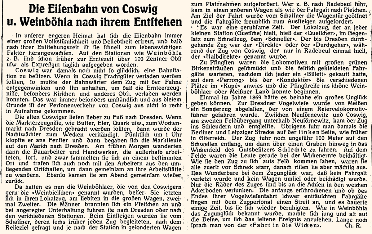 Ein Zeitungsausschnitt vom 30. März 1942, vermutlich aus dem Coswig-Weinböhlaer Tageblatt, ließ mich stutzen. Sollte wirklich ein Zugunglück zwischen Neusörnewitz und Coswig Ursprung des umgangssprachlich und wahrscheinlich nur in unserer Region gebrauchten Ausdruckes "Das ging in die Wicken“, für etwas Missglücktes, gewesen sein? Doch lesen und urteilen Sie selbst: