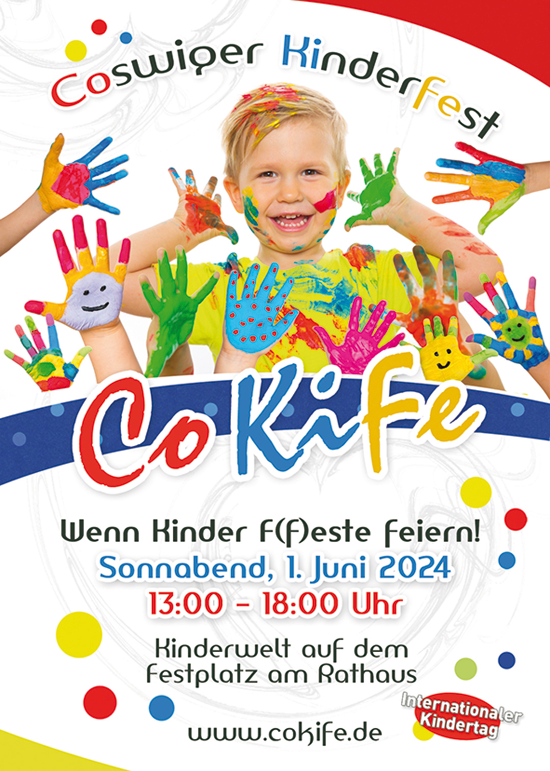 Am Samstag, den 1. Juni, zum Internationalen Kindertag, laden die JuCo Soziale Arbeit gGmbH, die Stadt Coswig und die Börse Coswig von 13:00 Uhr bis 18:00 Uhr zu einem aktionsreichen Kinder- und Familienfest ein. Die Eröffnung der Veranstaltung erfolgt um 13:00 Uhr mit einem anschließenden bunten Bühnenprogramm von Tanz über Musik bis zur Akrobatik. Zudem ist ab 15:00 Uhr mit Puppenbühne „Glöckchen“ ein Kaspertheater zu erleben. Neben dem Bühnenprogramm laden vielseitige Spiel-, Kreativ- und Bewegungsangebote wie Kletterwand, Bastel- und Spielstraße, Barfußpfad oder Kinderschminken in den Bürgerpark ein. Zudem wird eine Soccer Arena sowie ein Riesenfußballkicker auf die kommende Fußballsaison einstimmen. In der Karrasburg ist Flattergespenst „Cosimir“ unterwegs. Im Museum und Bibliothek dreht sich alles rund ums Papier, es wird gebastelt und gestöbert. Eintritt ist auch hier am Kindertag frei. Bei einem Stationslauf gibt es für die Kinder auch einige Überraschungen zu gewinnen.