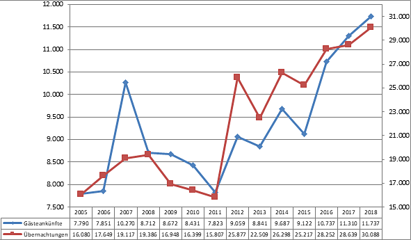 So wurden 2018 die Zahlen von 13 Betrieben beim Statistischen Landesamt erfasst. Unberücksichtigt bleibt bei diesen Zahlen jedoch der graue Beherbergungsmarkt, also diejenigen, die weniger als 10 Betten haben (z.B. Ferienwohnungen).