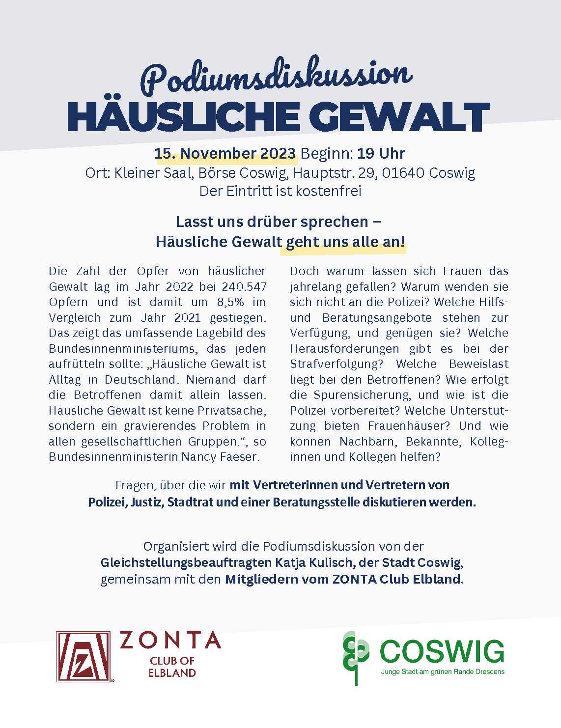 Am Mittwoch, 15.11.2023, 19 Uhr, findet im Gesellschaftssaal der Börse eine Podiumsdiskussion zum Thema Häusliche Gewalt statt. Dabei sind Vertreterinnen und Vertreter von Polizei, Justiz, Stadtrat und einer Beratungsstelle. Alle Interessenten sind herzlich eingeladen.