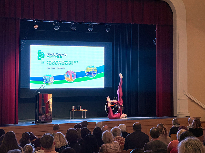Nach einigen Worten der Begrüßung hatte die Artistenschule Coswig ihren großen Auftritt. Drei ehemalige Schülerinnen der Artistenschule zeigten ihr Können. Bianca & Jessy, Mutter & Tochter, überzeugten mit einer Partnerakrobatik, Sylvi Ulrich begeisterte die Gäste mit Rollenbalance & Jonglage.