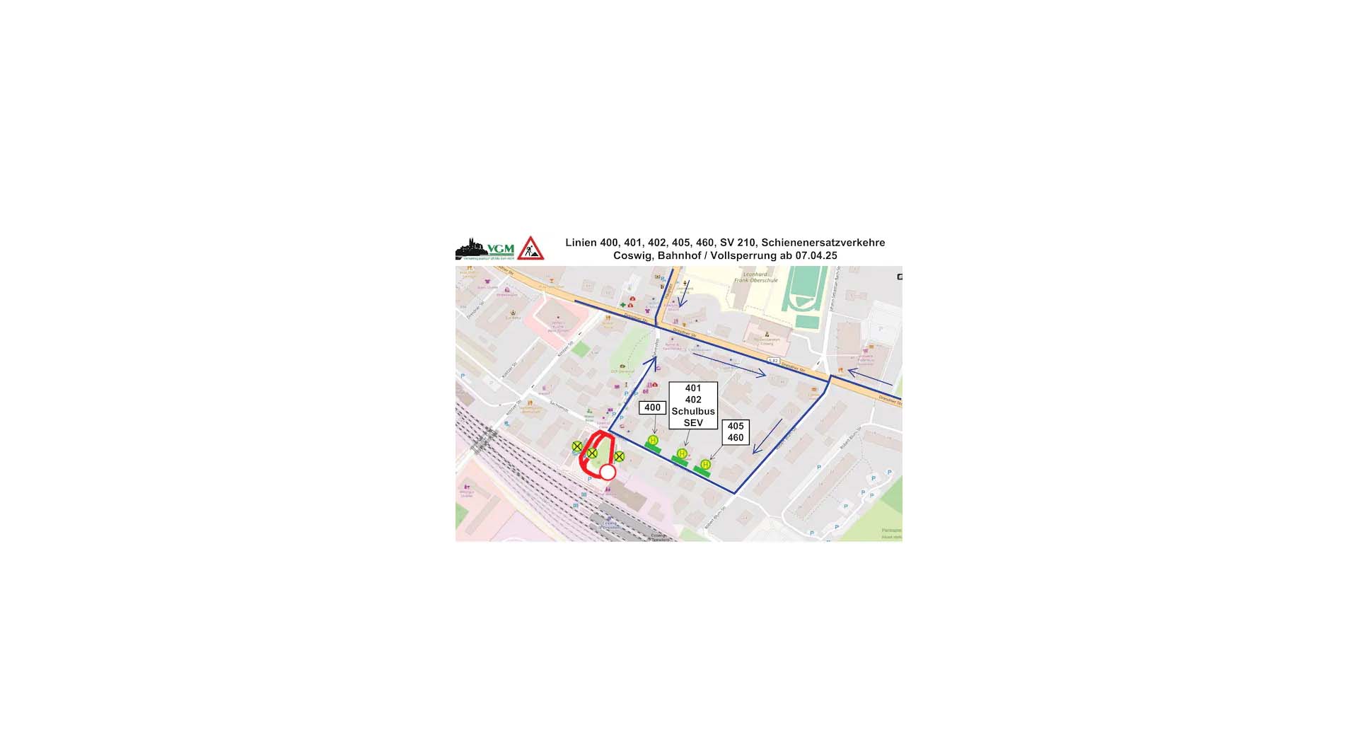 Vom 07.04.2025 bis 11.05.2025 ist zur Verlegung der notwendigen Kabel eine Vollsperrung des Bahnhofsvorplatzes einschließlich der Wendestelle, der Kurzzeitparkplätze sowie der Bushaltestellen erforderlich. Die Bushaltestellen werden in die Sachsenstraße zwischen Robert-Blum-Straße und Bahnhofsstraße verlegt. Die Robert-Blum-Straße wird wie die Sachsenstraße zur Einbahnstraße. In der Robert-Blum-Straße werden zusätzliche Parkmöglichkeit als Ersatz für gesperrte Flächen eingerichtet. Der Bahnhofsvorplatz soll bereits ab dem 12.05.2025 wieder nutzbar sein, sodass die Busse wieder an ihren eigentlichen Haltestellen verkehren können.